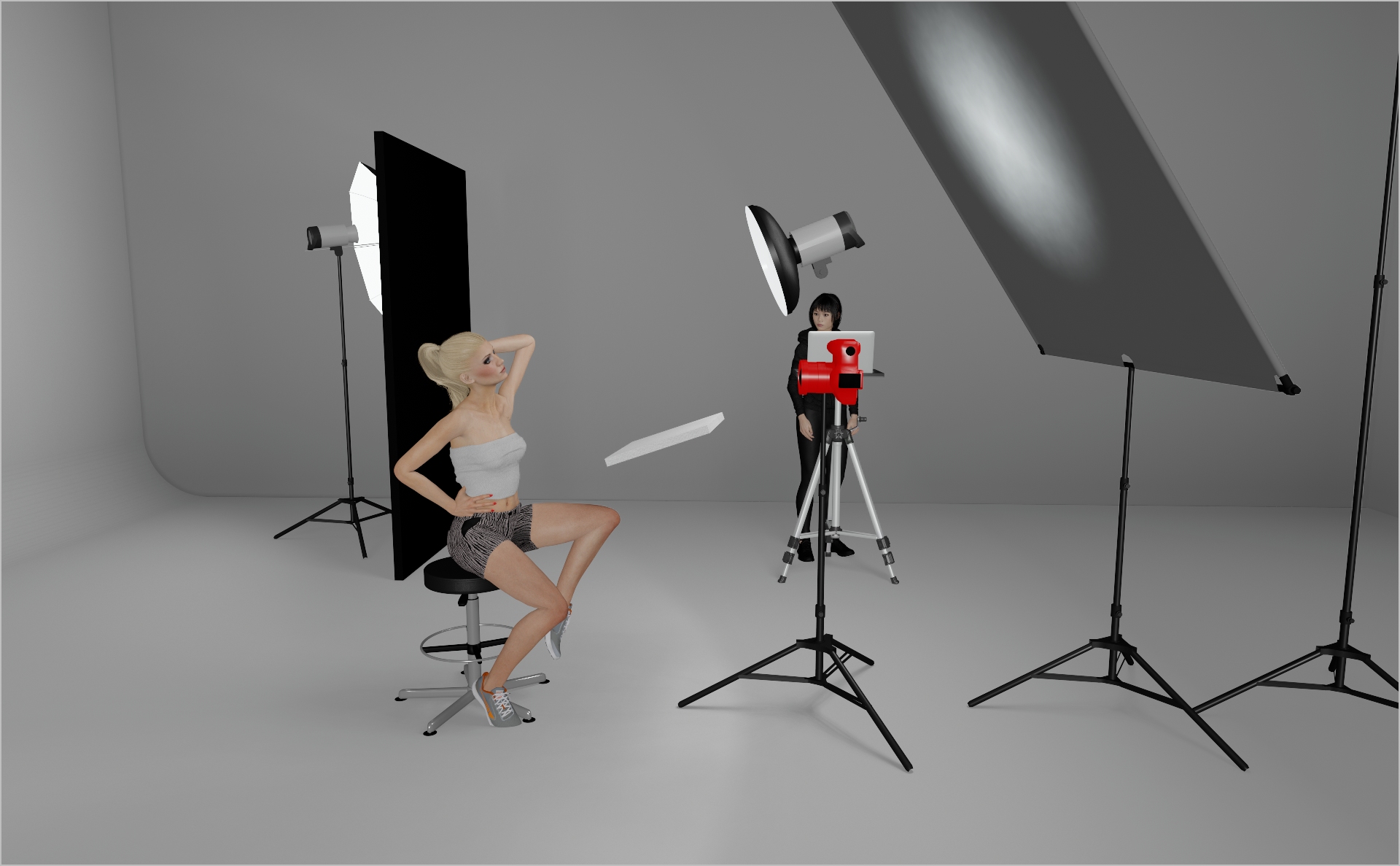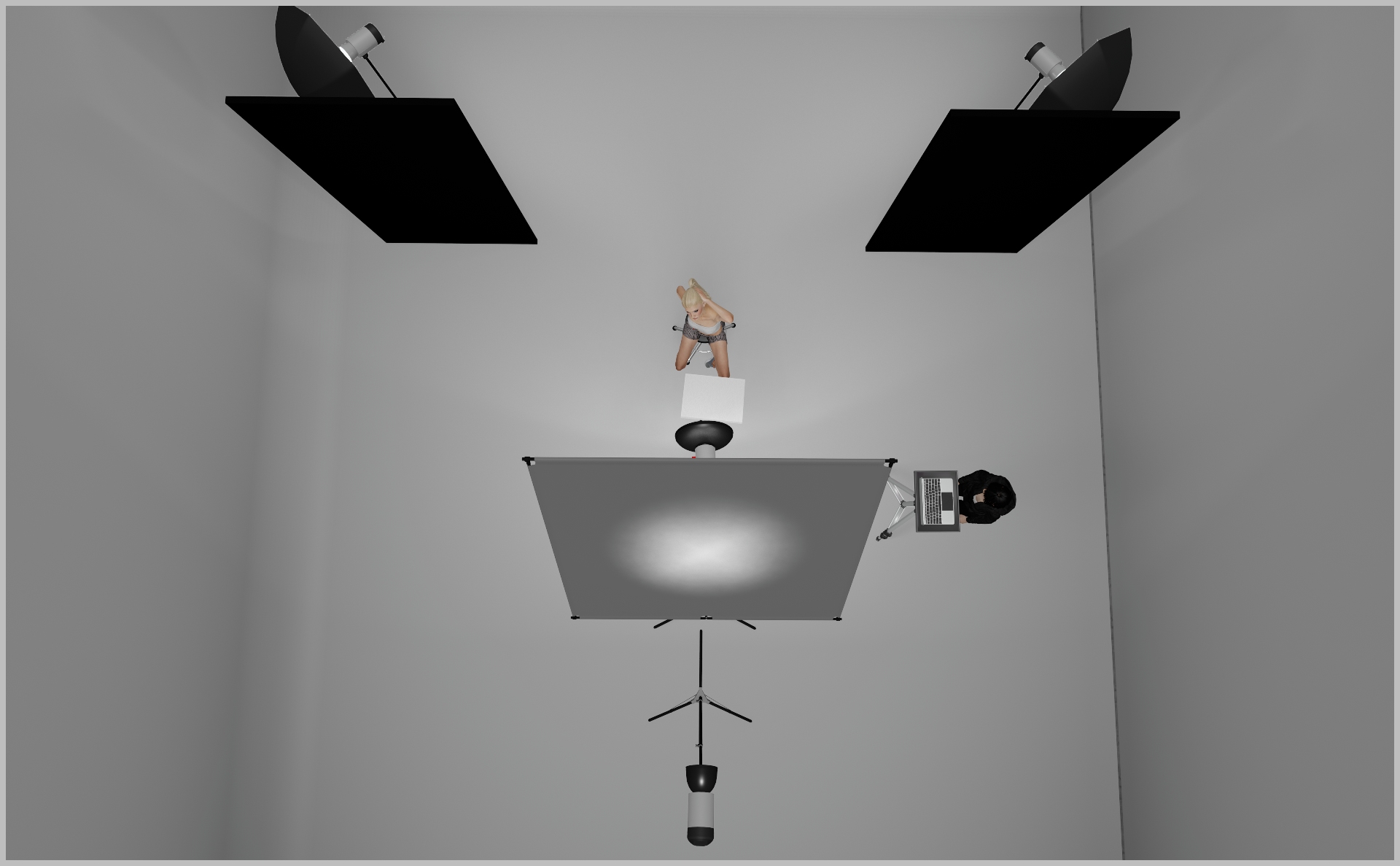 - Tilt it roughly 40° down toward the model for that signature beauty-light look—smooth midtones, crisp highlights. This is your key-light.
