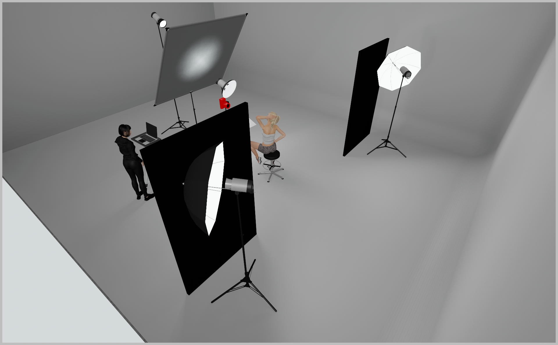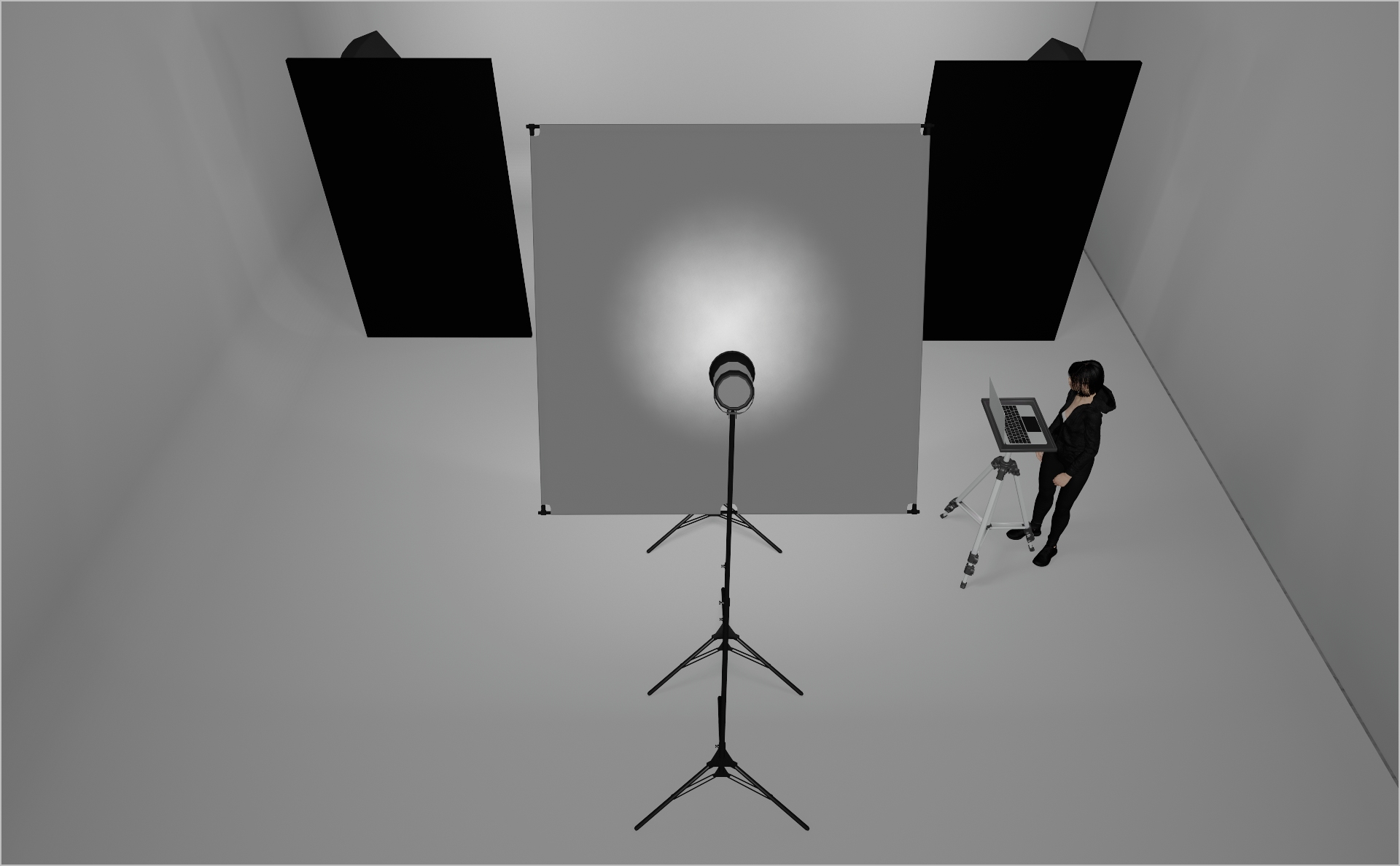 - Mount two Profoto White Medium umbrellas at the back to evenly wash the backdrop with soft light.
