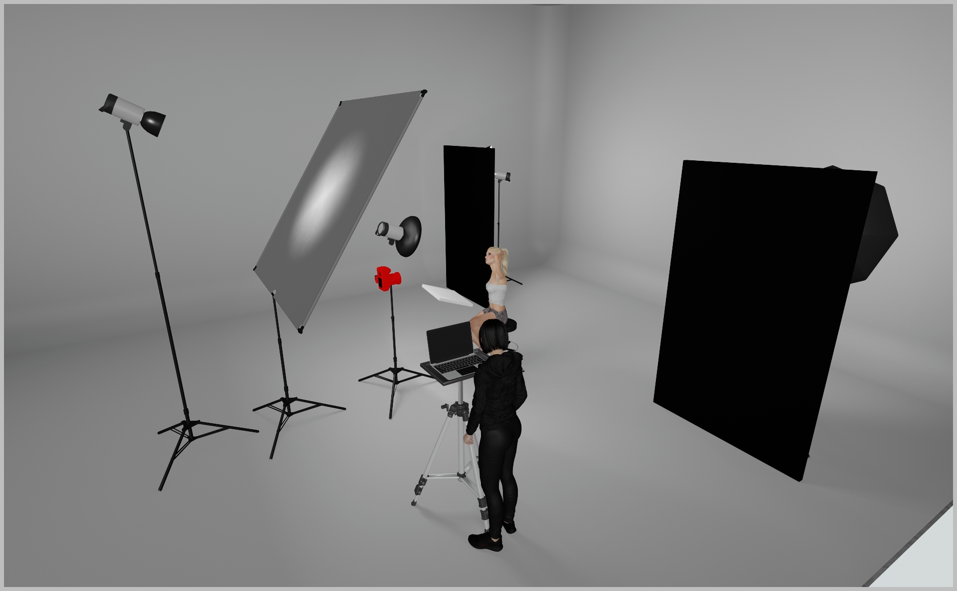 - Add a small white polyboard under the model’s chin to soften any harsh shadows.