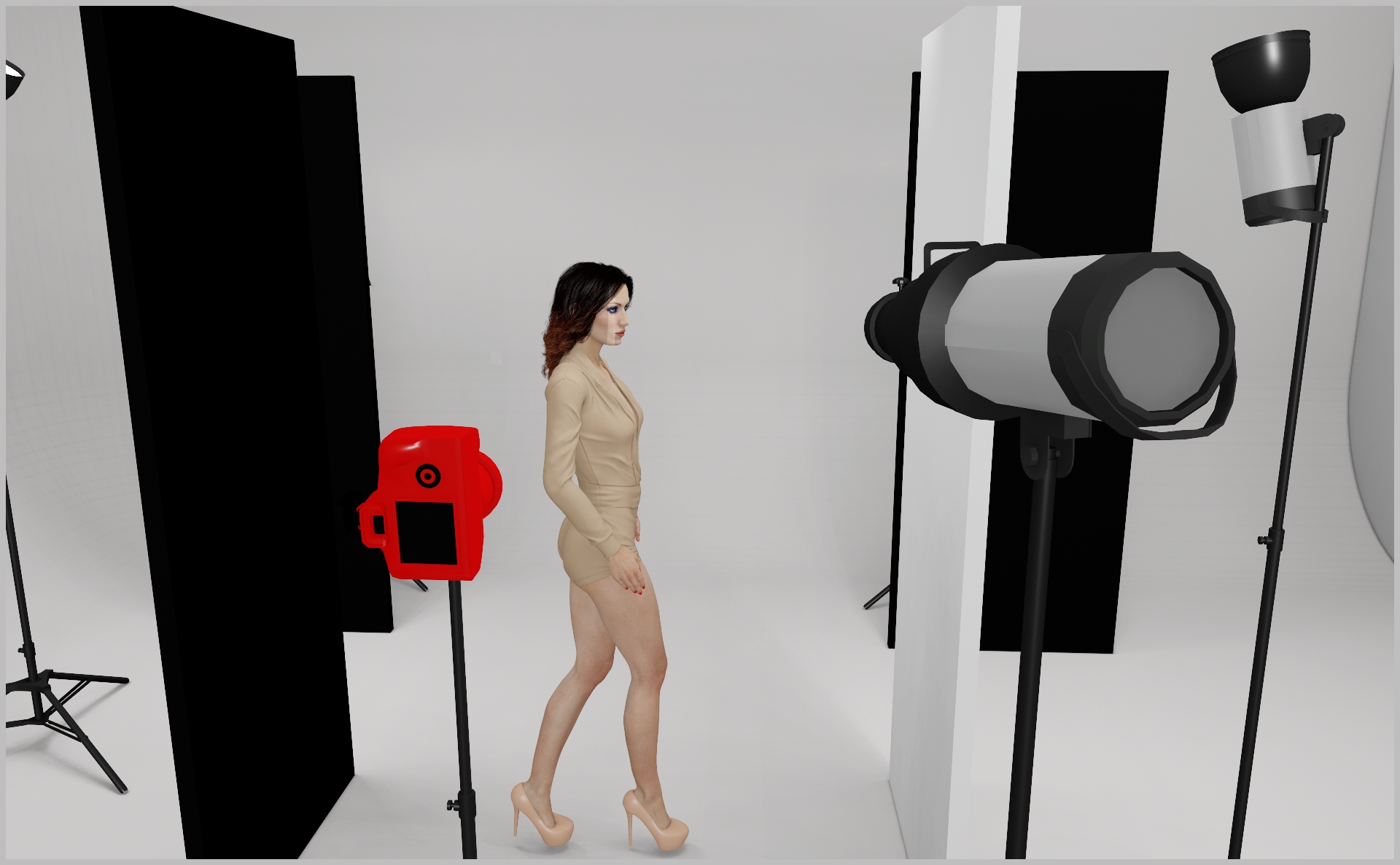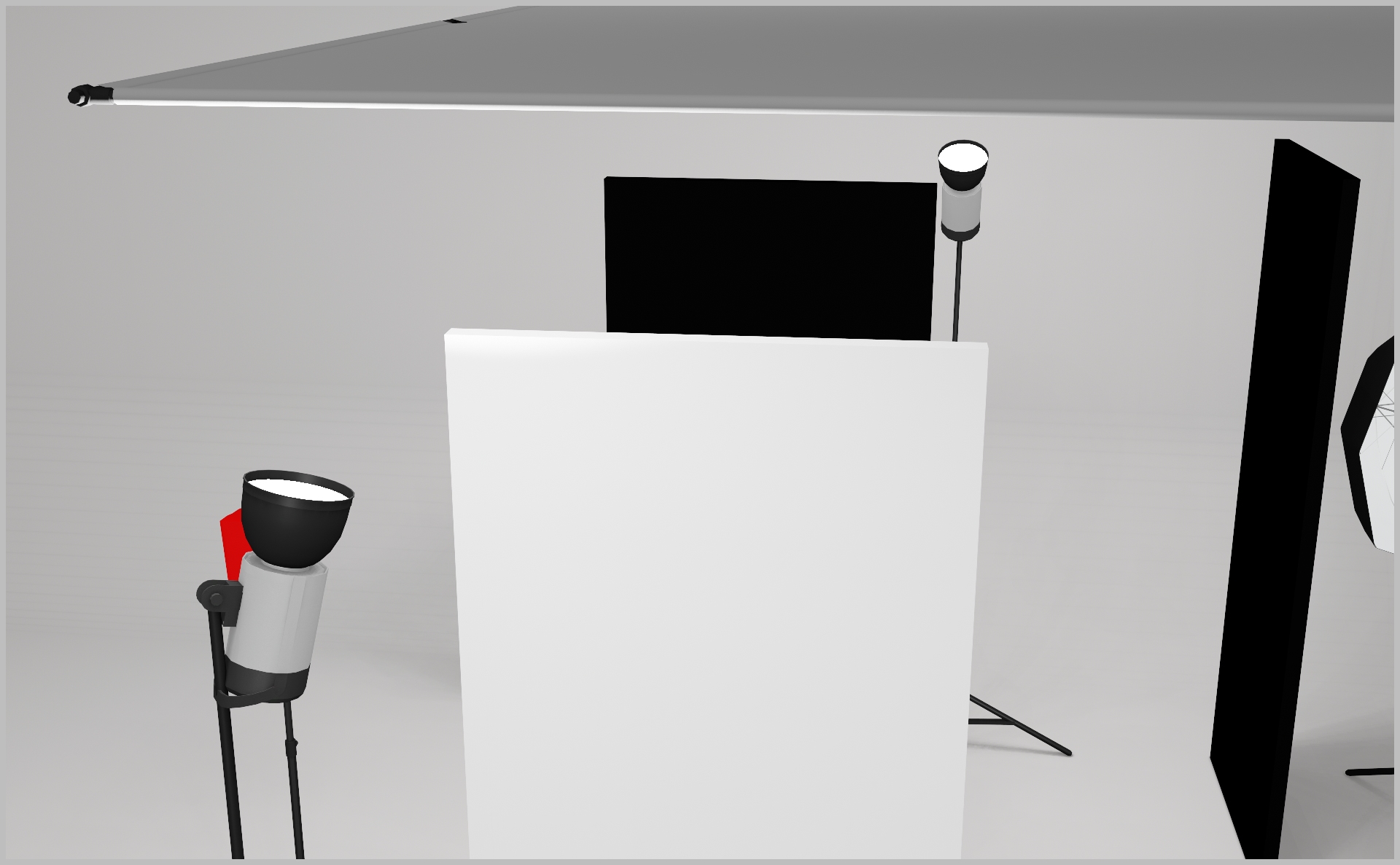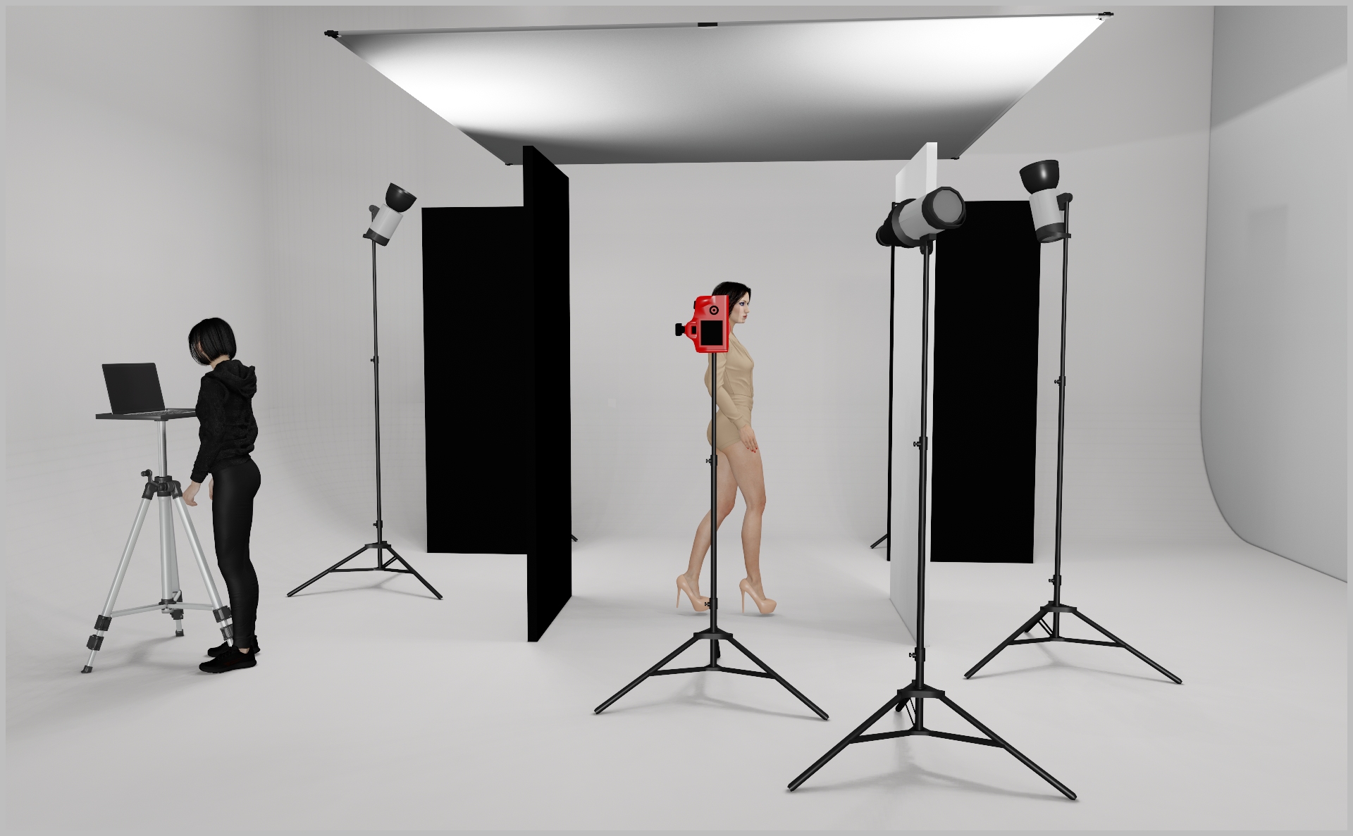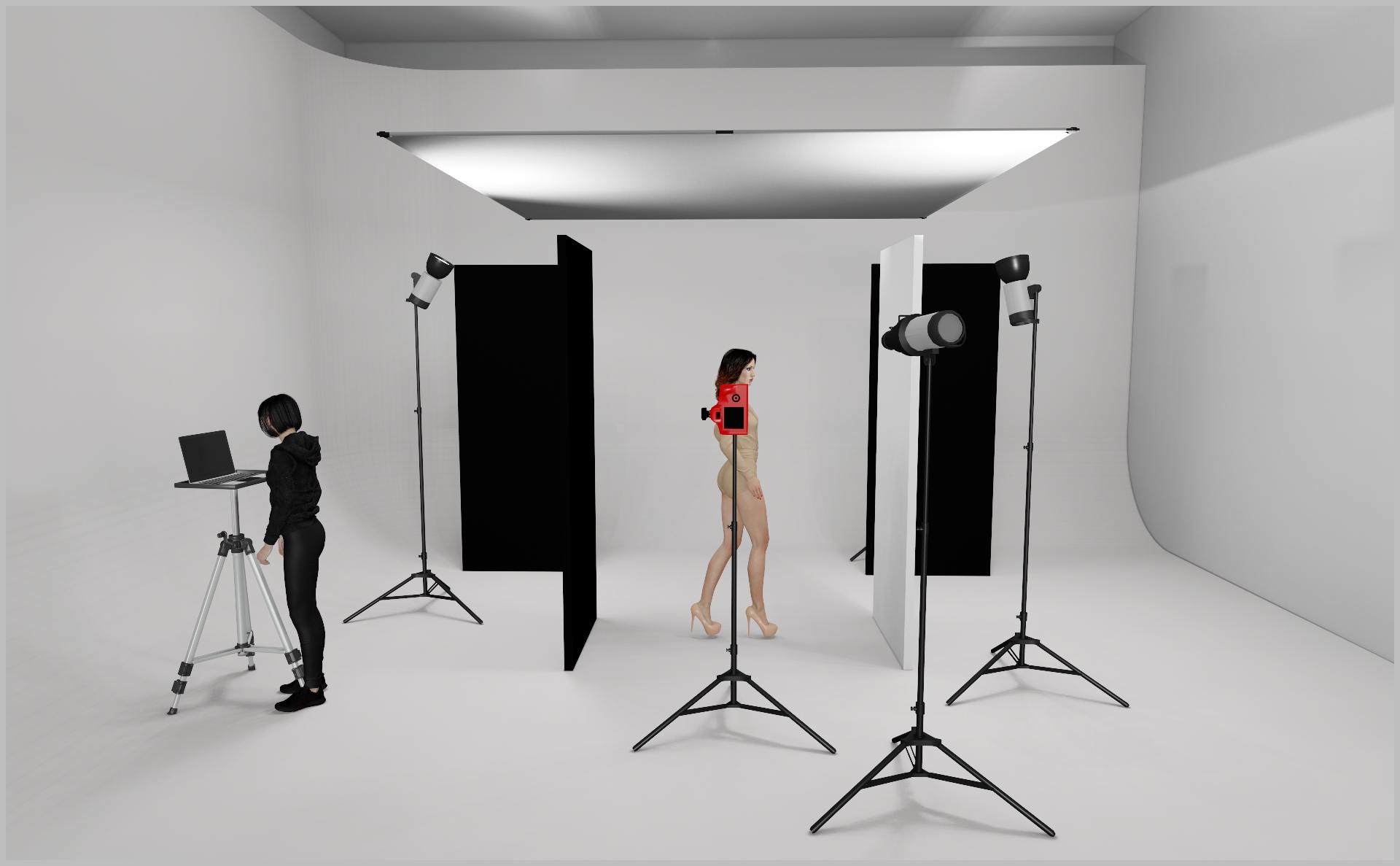 - Add a black polyboard on the model’s left for contrast and a white polyboard on the other side for fill.
