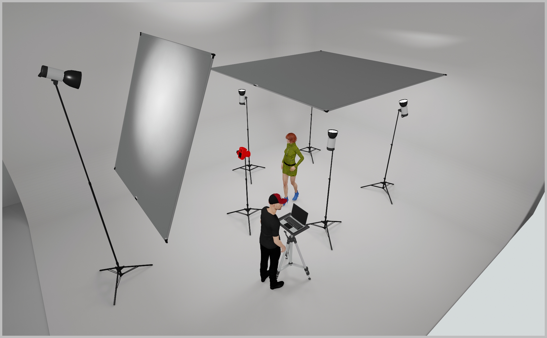 - Mount four Profoto ProHeads with Zoom Reflectors—two behind and two in the front—aimed up at the fabric so the light bounces back for an ultra-soft wrap.(see 3D renedering)