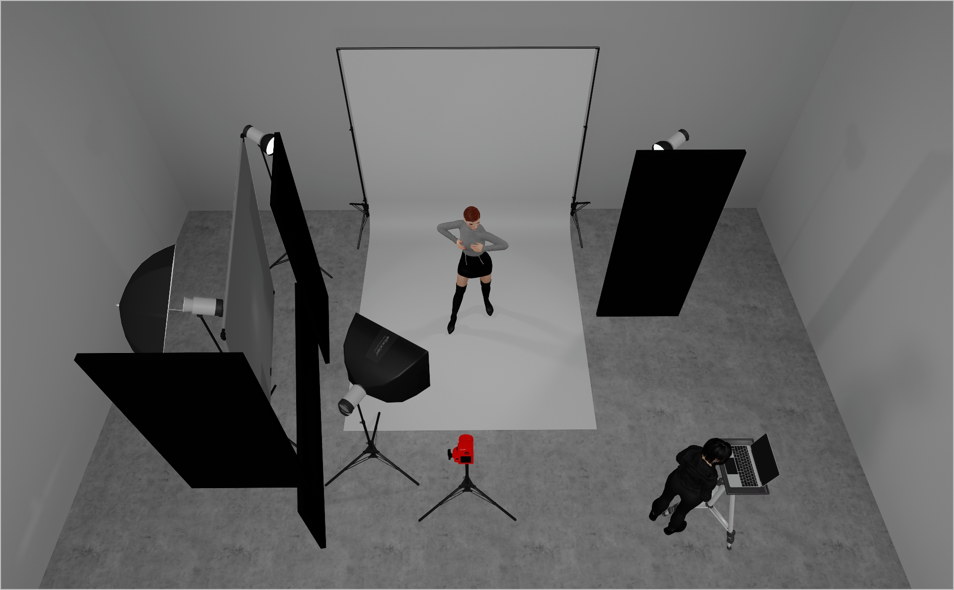 - Flag each light with a black polyboard (as shown in the 3D render) to block unwanted spill into the set.