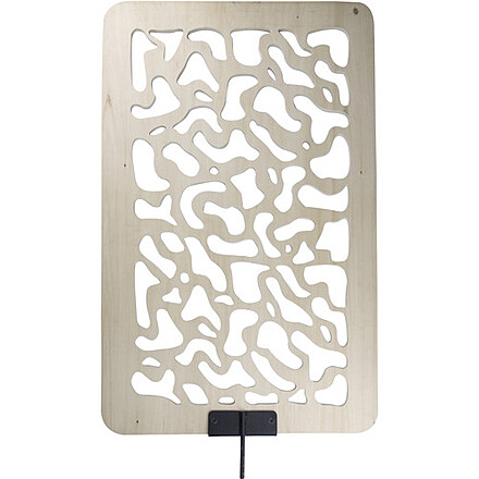 A cut-out panel, often made of wood, metal, or foam core, with irregular patterns that break up light into shapes and textures.